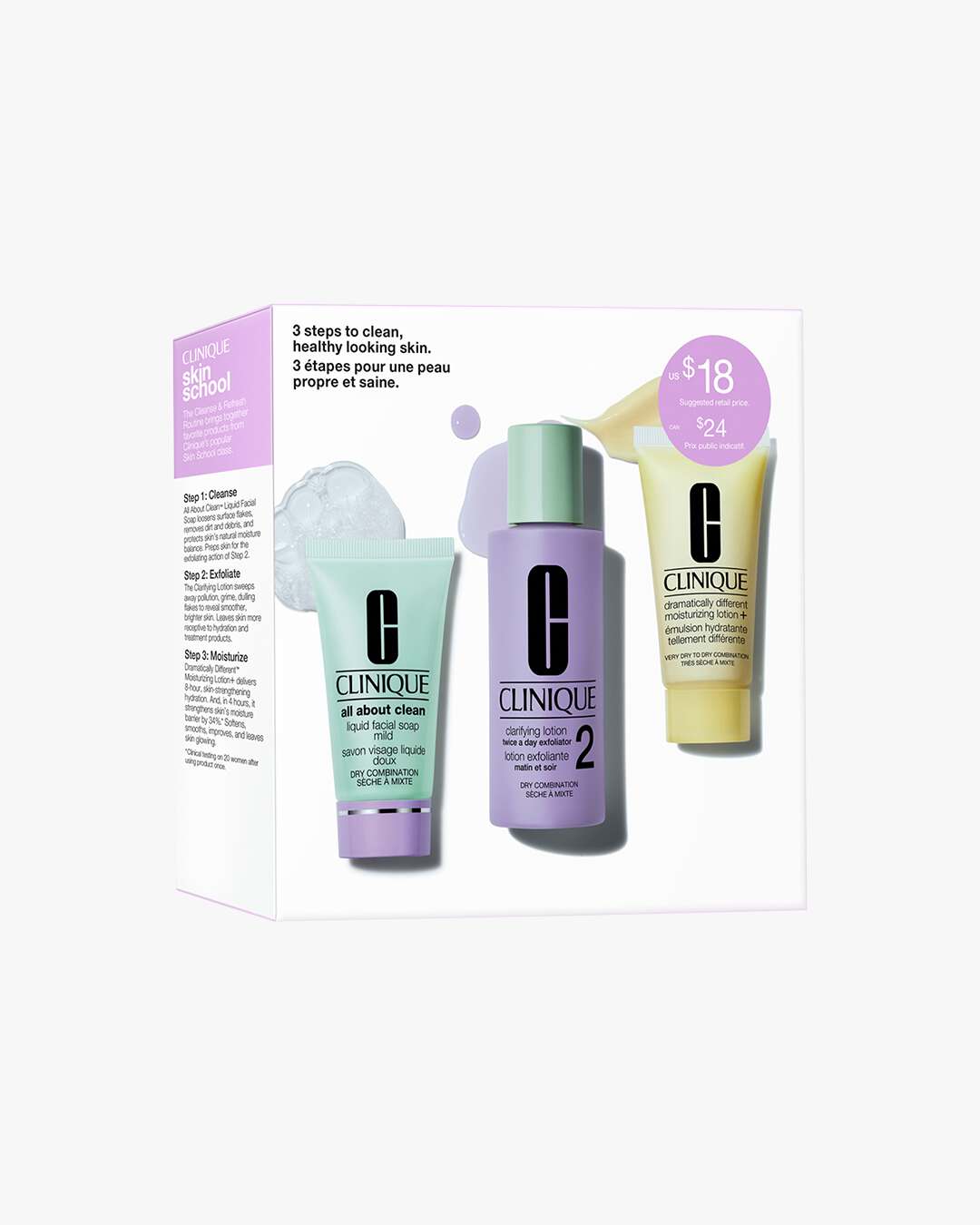 Clinique 3-Step Skin Care Intro Set har alt det du trenger for en vakker hud. En effektiv basishudpleie utviklet av hudleger der hvert trinn forbereder huden til det neste. Rens, eksfolier og fukt. Skreddersydd til en tørr/kombinert hud.