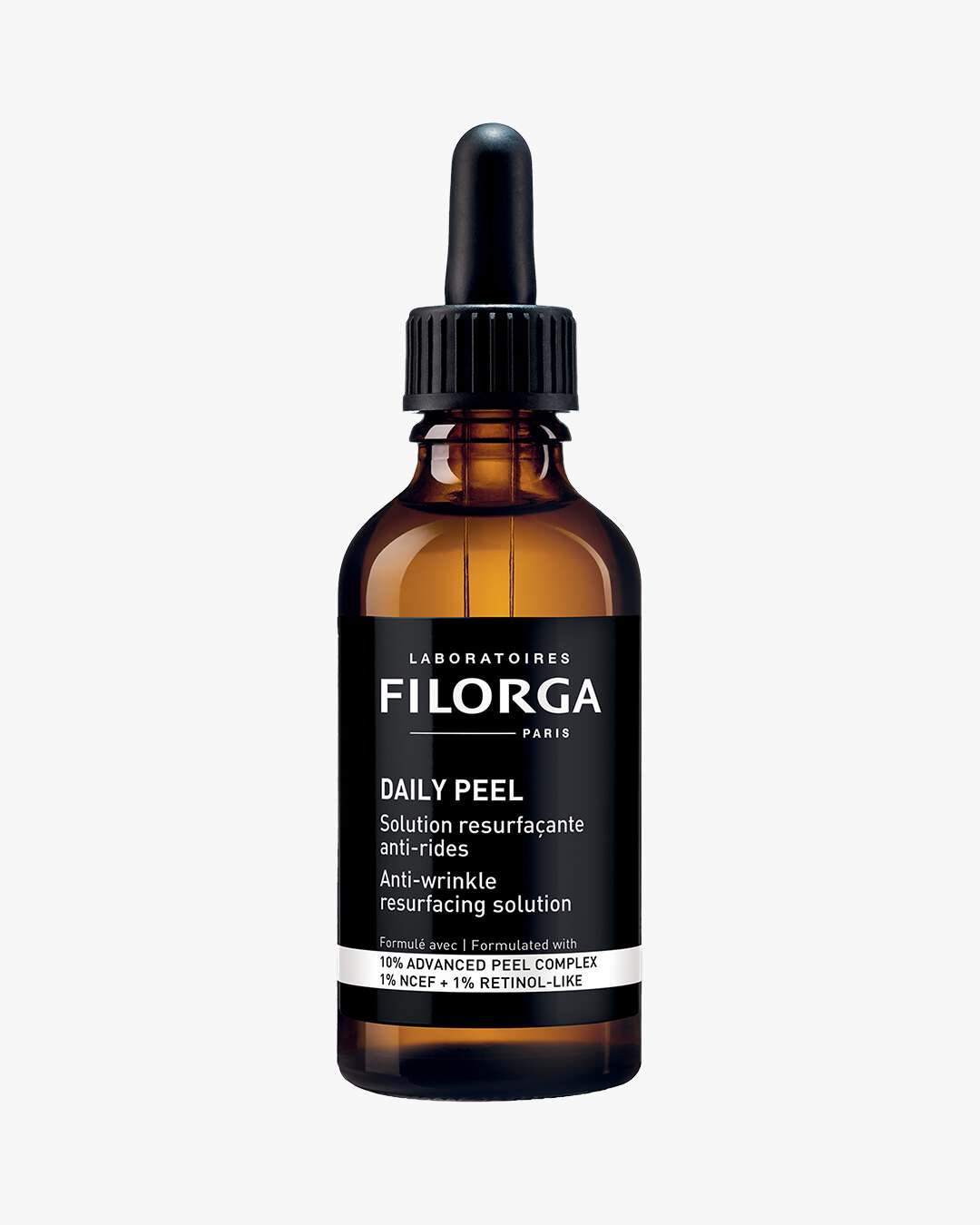 Filorga Daily Peel Anti-Wrinkle Resurfacing Solution er en avansert nattpeeling – inspirert av profesjonelle behandlinger og utviklet for synlig å redusere rynker, forbedre hudens tekstur og gjenopprette glød. Formelen kombinerer 10% Advanced Peel Complex – en blanding av melkesyre, mandelsyre og natriumpyruvat – for en skånsom eksfoliering som kan brukes daglig. Et retinol-lignende ingrediens bidrar til å glatte ut fine linjer og stimulere hudens naturlige kollagenproduksjon, mens det unike NCEF-komplekset, utviklet av Filorga, forbedrer hudkvaliteten over tid. Den ultralette teksturen absorberes raskt uten å føles klebrig.
