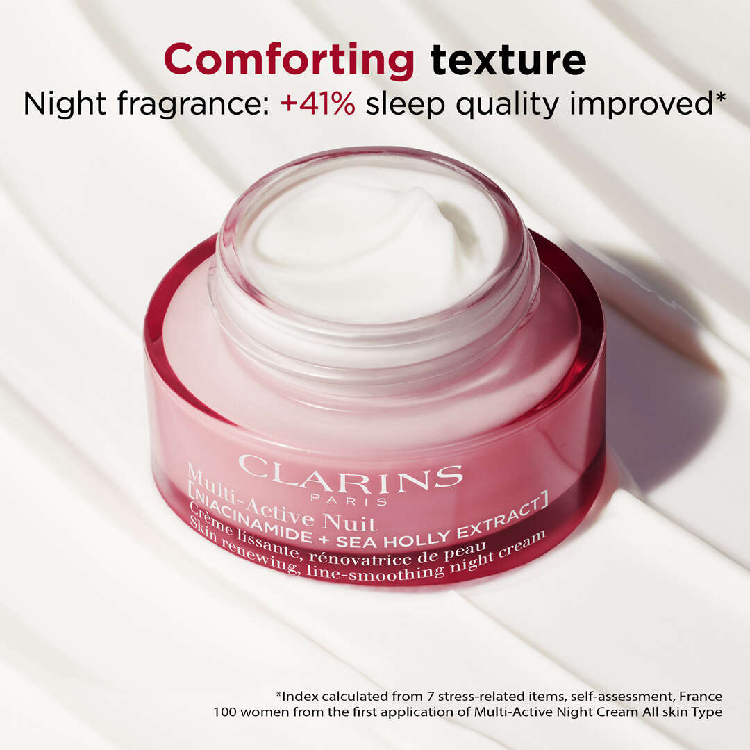 Clarins Multi-Active Night Cream All Skin Types. Siden huden er spesielt belastet i løpet av dagen, er nattetid det optimale tidspunktet for å fornye huden. Denne nattkremen, med 92% naturlige ingredienser, fornyer og regenererer huden med sin innovative teknologi: