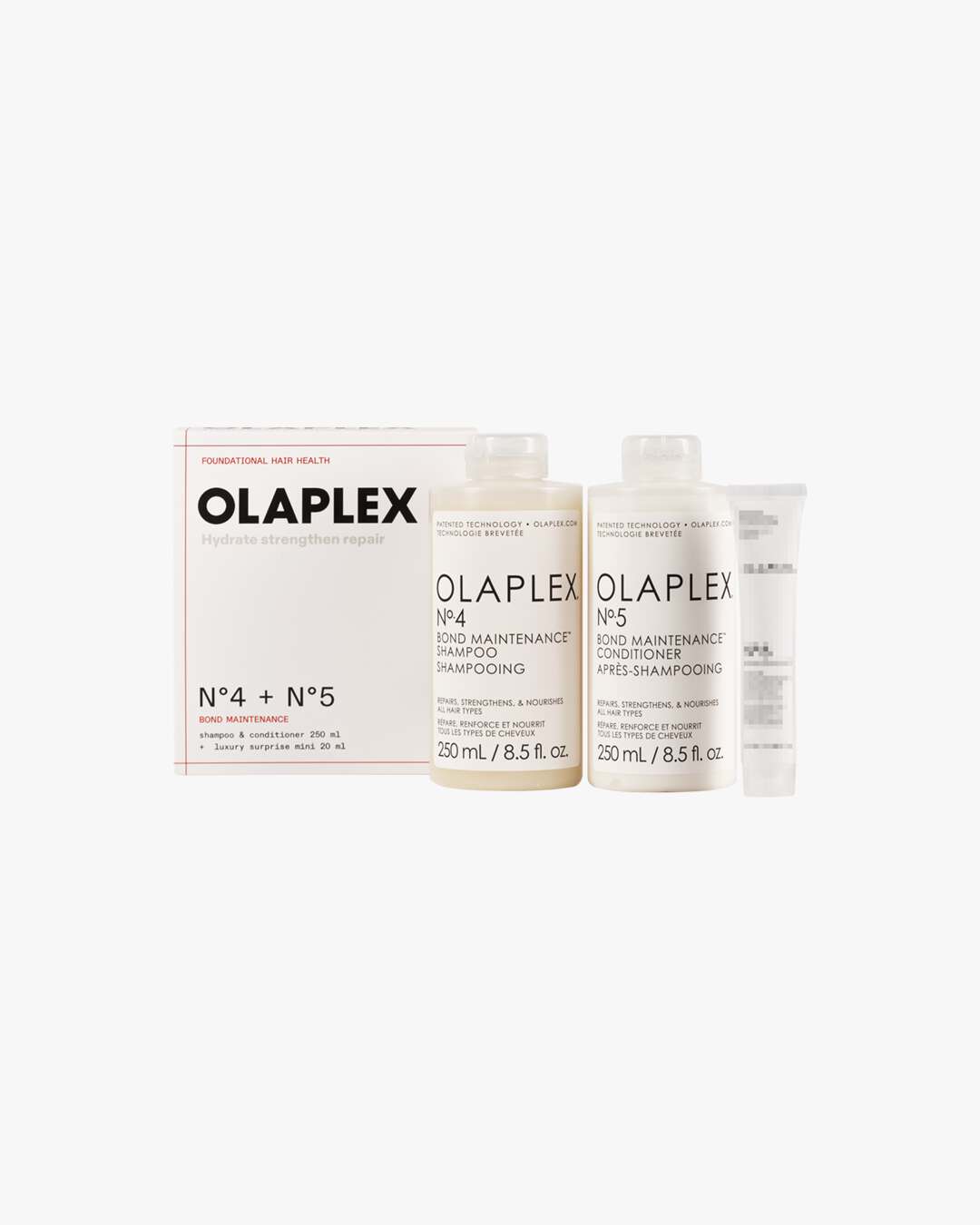 Olaplex No.4 & No.5 Bond Maintenance Duo Box. Gi håret en komplett OLAPLEX-opplevelse med denne eksklusive boksen som inneholder to ikoniske favoritter – No.4 Bond Maintenance® Shampoo og No.5 Bond Maintenance® Conditioner – samt en Luxury Surprise Mini (20ml) av en av Olaplex’ bestselgere. Perfekt som gave eller for å ta salongkvalitet med hjem.
