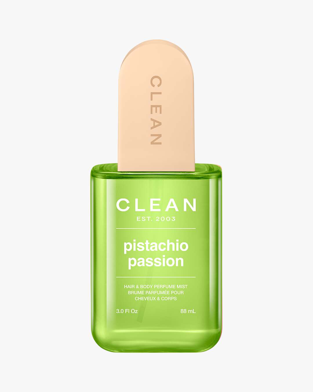 Clean Pistachio Passion Hair & Body Perfume Mist balanserer det kremete med det friske – en duft som føles som en liten hemmelig nytelse du ikke trenger å dele med noen. Duften åpner med myk pistasj, varm rom og frisk bergamott. I hjertet møtes iris, sedertre og jasmin i en fløyelsmyk, smøraktig varme. Basen avrundes med amber, tonkabønne og eikemose som gir en myk gourmandkarakter, like avhengighetsskapende som din favorittdessert. For en ekstra kremet, varm og søt layering-kombinasjon, prøv sammen med Whipped Vanilla.
