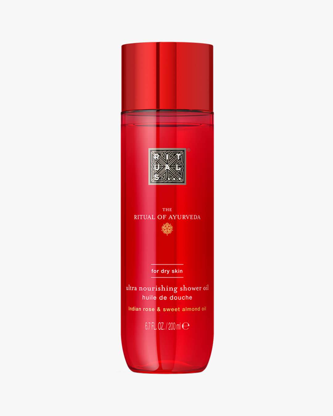 Rituals The Ritual of Ayurveda Shower Oil. Rens og plei huden din med denne ultranærende 2-i-1 dusjoljen. Den silkemyke oljen forvandles til et mykt skum når den kommer i kontakt med vann, og renser huden skånsomt samtidig som den beroliger og tilfører næring. Den er egnet for alle hudtyper, etterlater huden myk og jevn, mens den varme blomsterduften av indisk rose og søt mandelolje skaper en varig følelse av harmoni.
